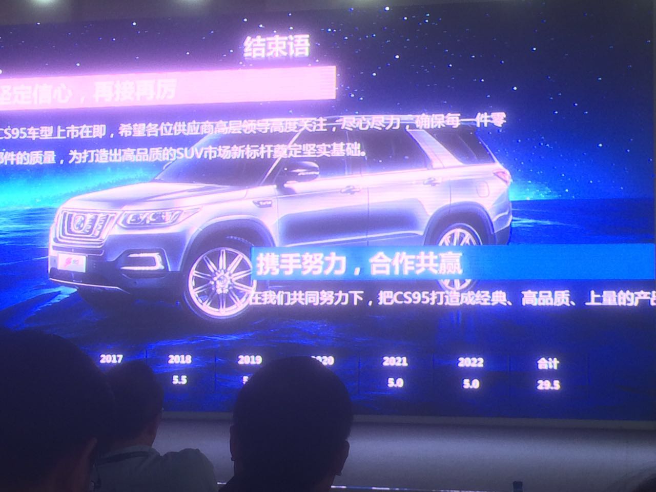 长安汽车CS95重点供应商大会于2016年5月25日在北京长安召开。89家重点供应商参加。北京天元作为FPM/VMQ涡轮增压管路与NVH系统集成主供应商参加会议。长安集团刘波副总裁强调无论哪家供应商在CS95(长安内部代号S401)车型上出现任何问题,该供应商一切业绩归零。CS95对标长城哈弗H7,预计2016年12月份量产。2017年计划产量35000辆。