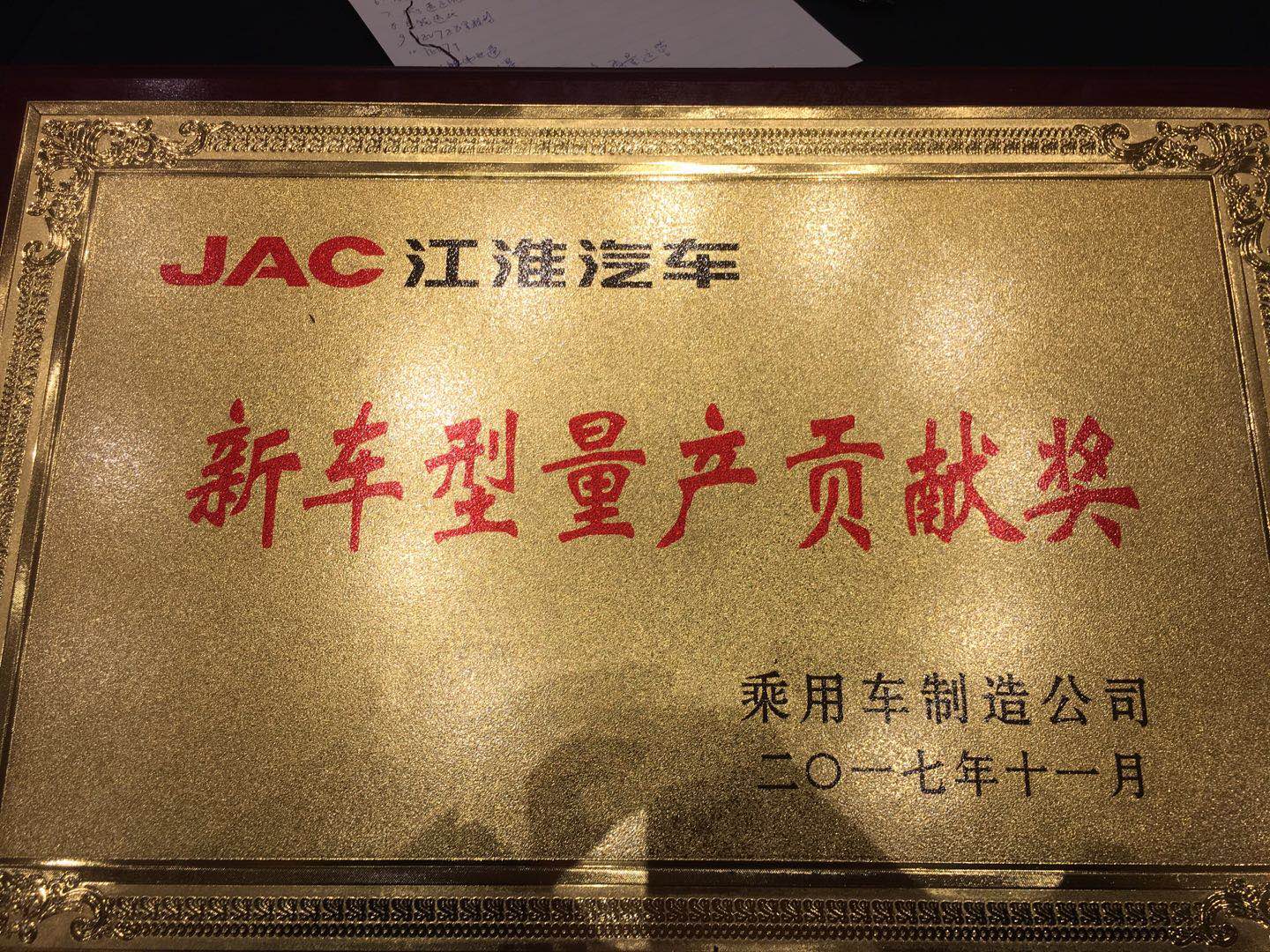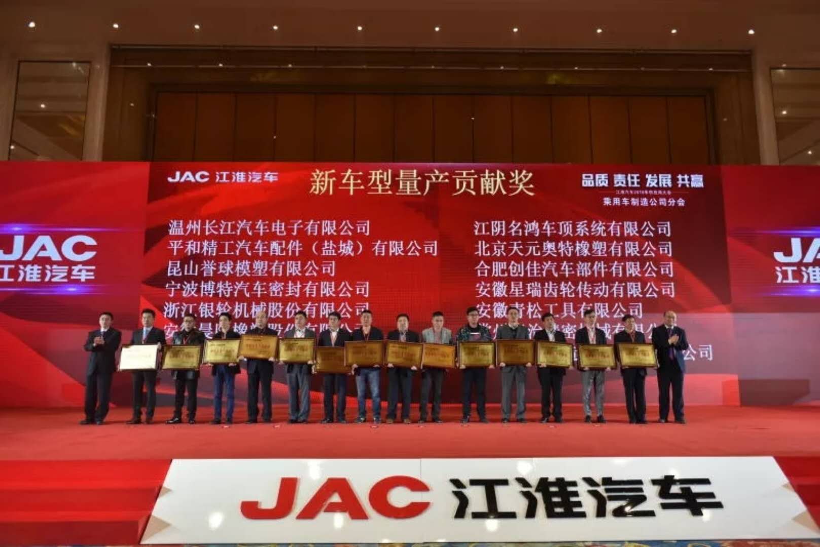 2017年11月14日~16日,主题为“品质、责任、发展、共赢”的江淮汽车2017年供应商大会在合肥举行。北京天元奥特橡塑有限公司荣获江淮乘用车“新车型量产贡献奖”殊荣。公司总经理、总工程师李警与会。