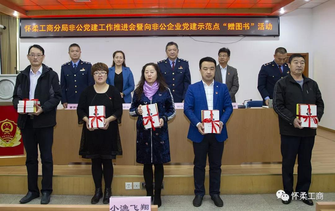 怀柔工商分局召开非公党建工作推进会暨向非公企业党建示范点“赠图书”活动。区委组织部副部长金文领,区社工委副书记郭宝新,区工商分局党组书记、局长任江云,纪检组长蒋旭东,稽查大队队长曹宇翔出席会议。 为了更好的提高优秀非公企业党支部党建工作水平,区工商分局为每个党建示范点赠送了26册的图书,用于党支部学习使用。天元奥特支部为优秀非公支部之一接受赠书。