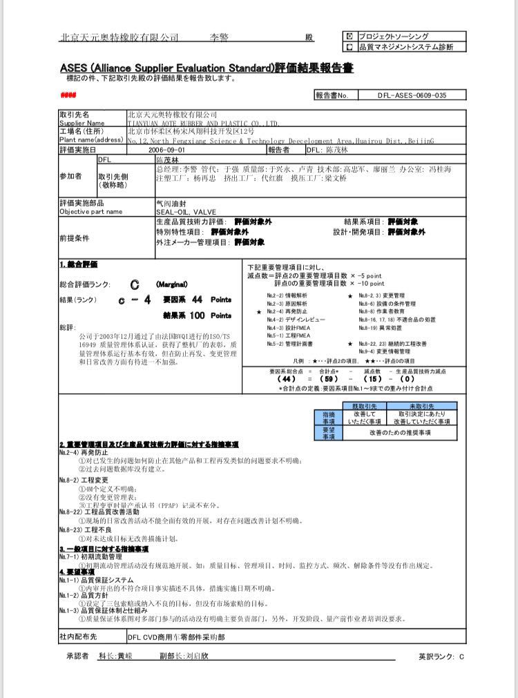 2018年12月19日,总经理李警拜会日产全球ASES、PESES首席评价专家,东风汽车股份有限公司采购部副部长西村裕文,双方就北京天元与全资子公司武城天元开展ASES评价活动进行了交流。日产、雷诺与三菱的质量保证体系均以ASES为评价标准,且体系评价结论全球共享。北京天元2006年通过了ASES评价。